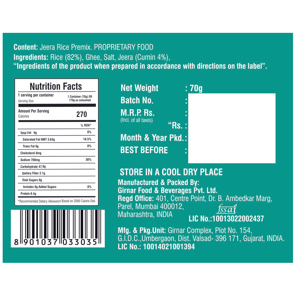 Rice (82%), Ghee, Salt, Jeera (Cumin 4%).