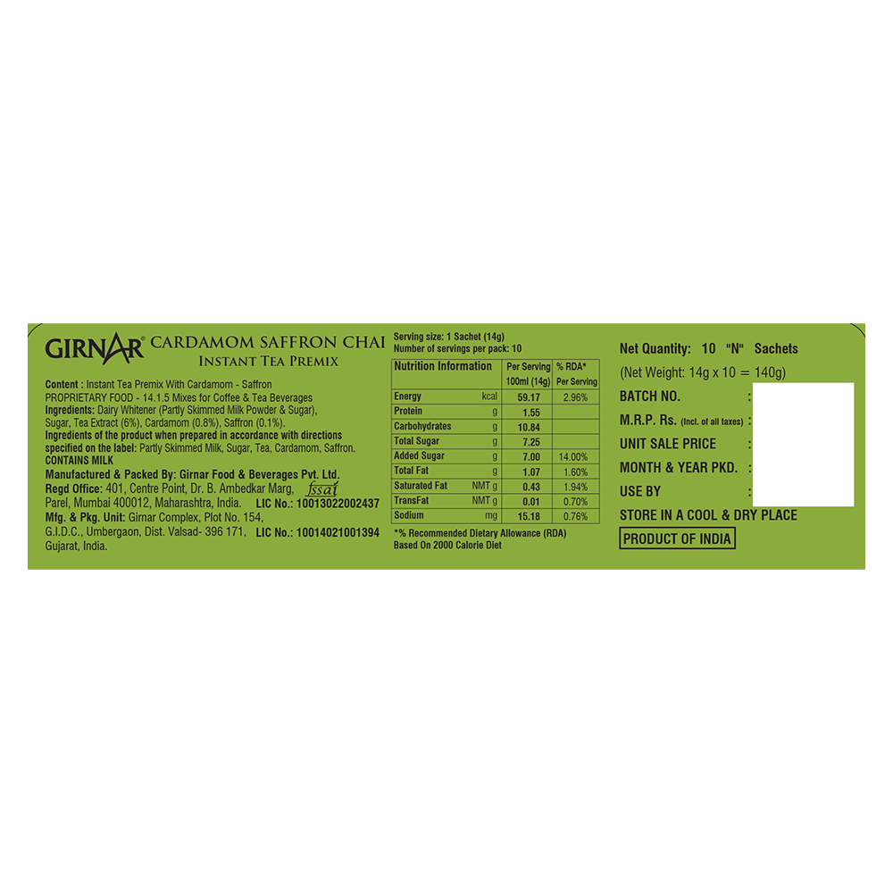 All this without the brewing wait. Or numerous ingredients to accumulate. Girnar’s Cardamom Saffron Chai Premix is ready before you contemplate!