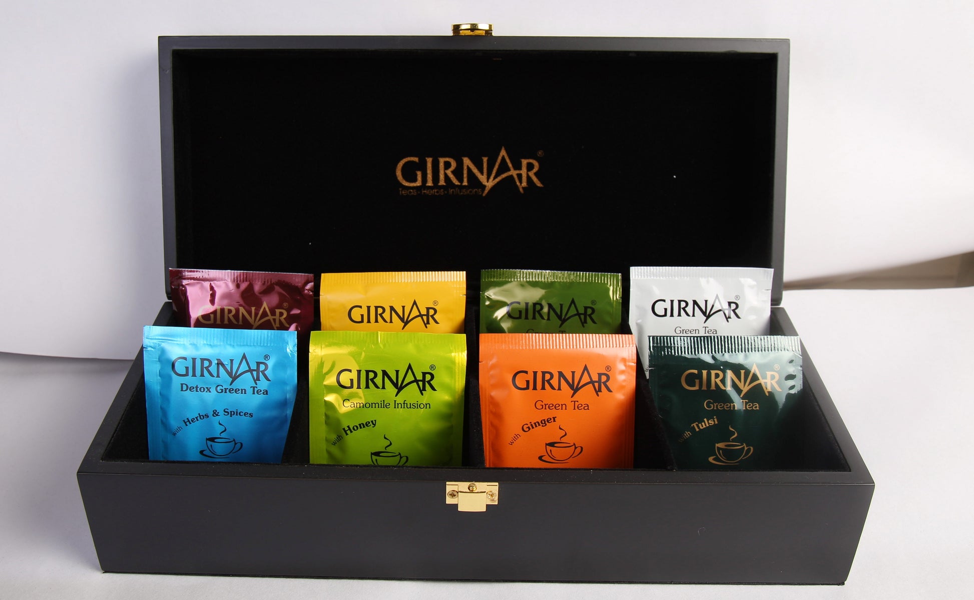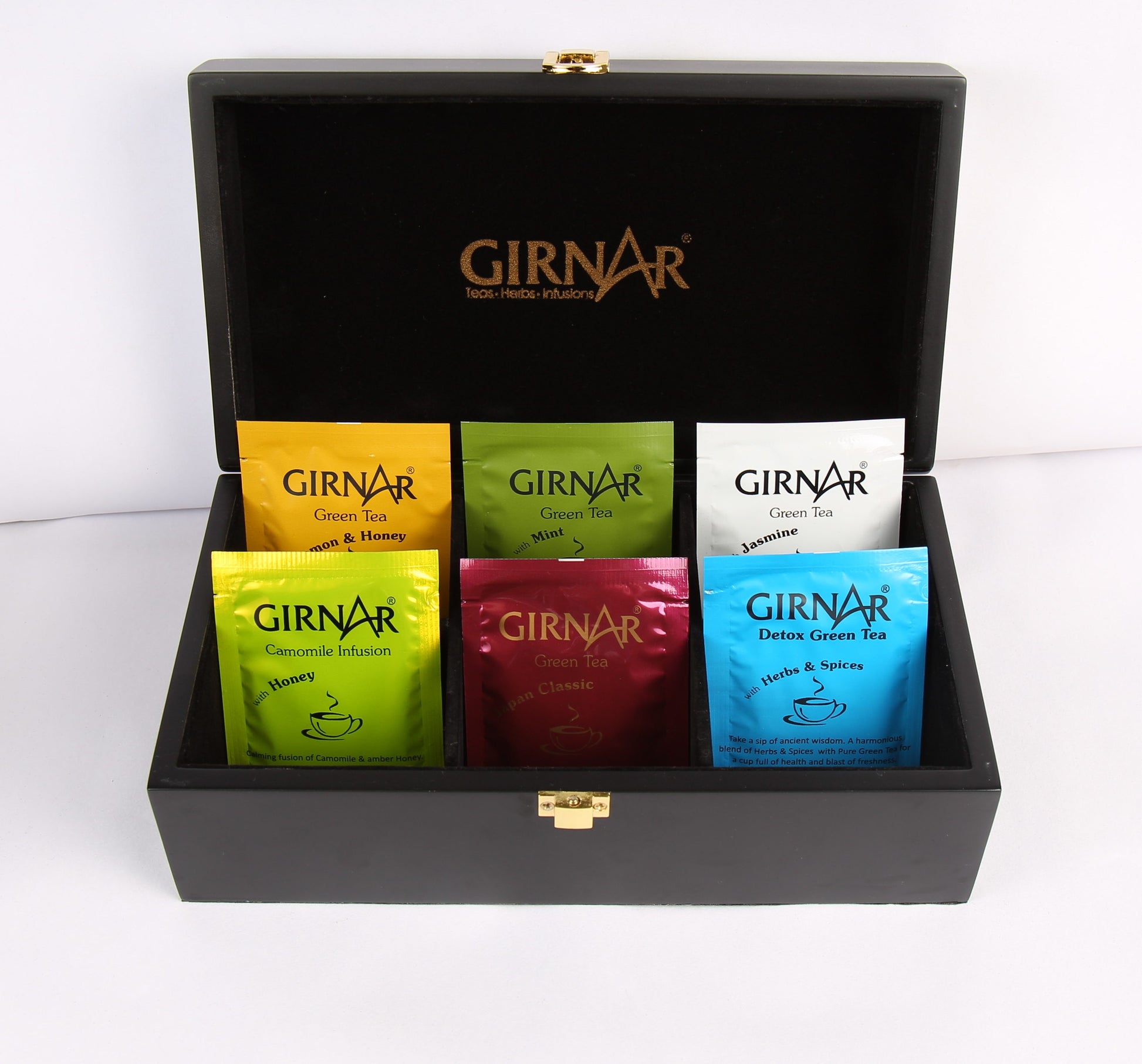 In the Founder’s Collection luxury chest, each slot contains 10 individually foil-wrapped tea bags of the following varieties: 6 Slot Presenter : Green Teas(Mint, Lemon & Honey, Detox, Jasmine, Japan Classic), Camomile & Honey. 8 Slot Presenter : Green Teas(Detox, Tulsi, Ginger, Mint, Lemon & Honey, Jasmine, Japan Classic), Camomile & Honey. 12 Slot Presenter : Green Teas (Tulsi, Ginger, Cardamom, Mint, Lemon & Honey, Jasmine, Earl Grey, Detox, Live Lite, Japan Classic), Infusion Deep Bags (Cool Peppermint, Camomile & Honey).