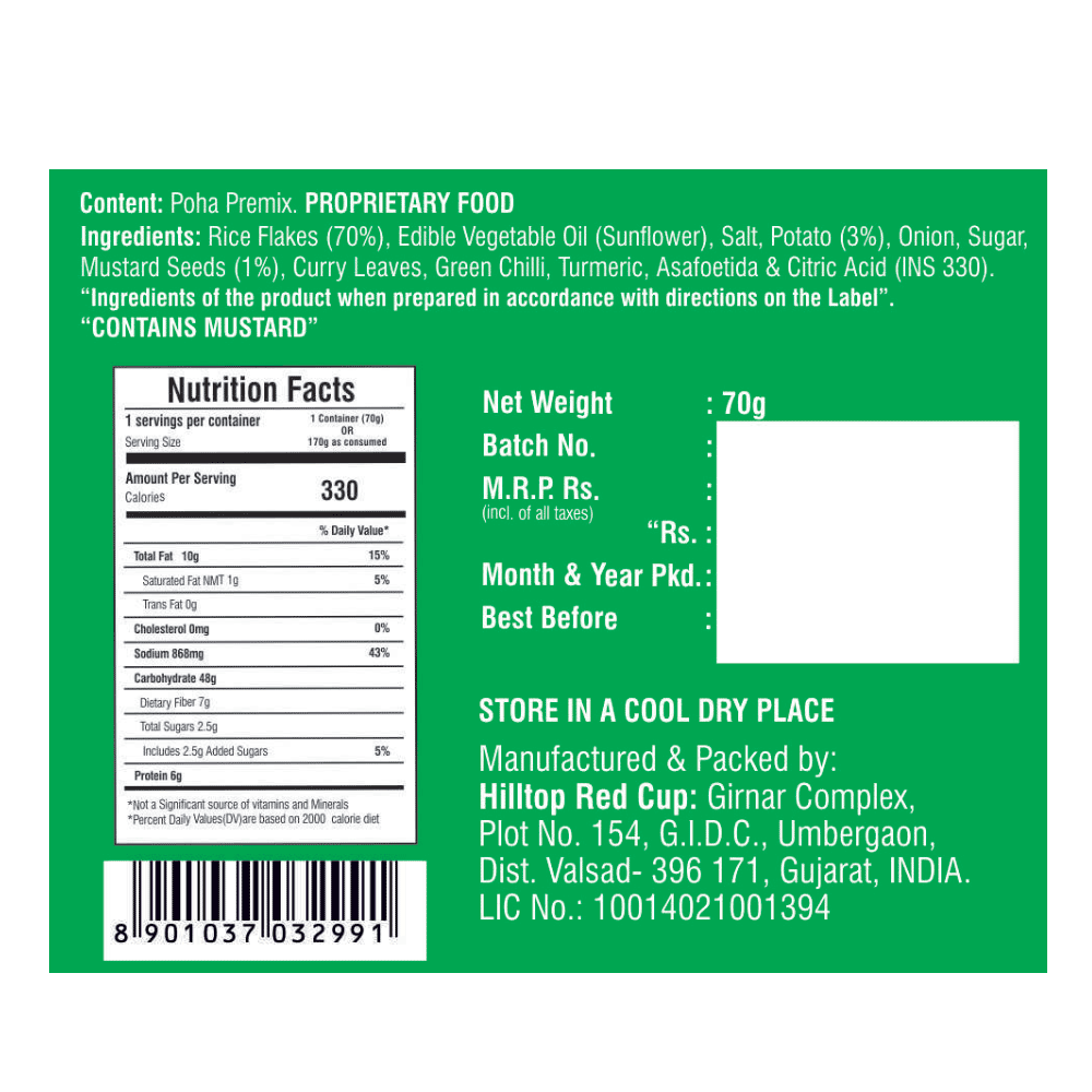 Rice Flakes, Edible Vegetable Oil, Salt, Potato, Onion, Sugar, Mustard Seeds, Curry Leaves, Green Chilli, Turmeric, Asafoetida & Citric Acid.