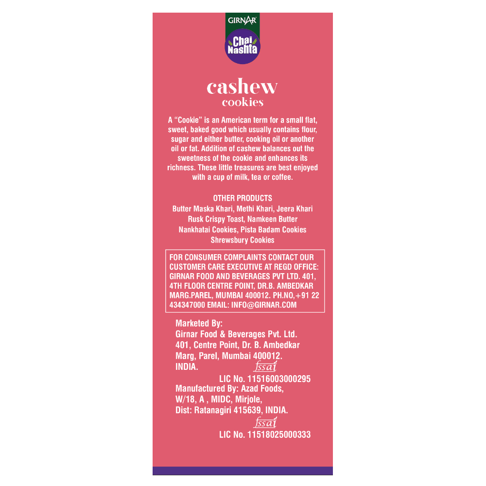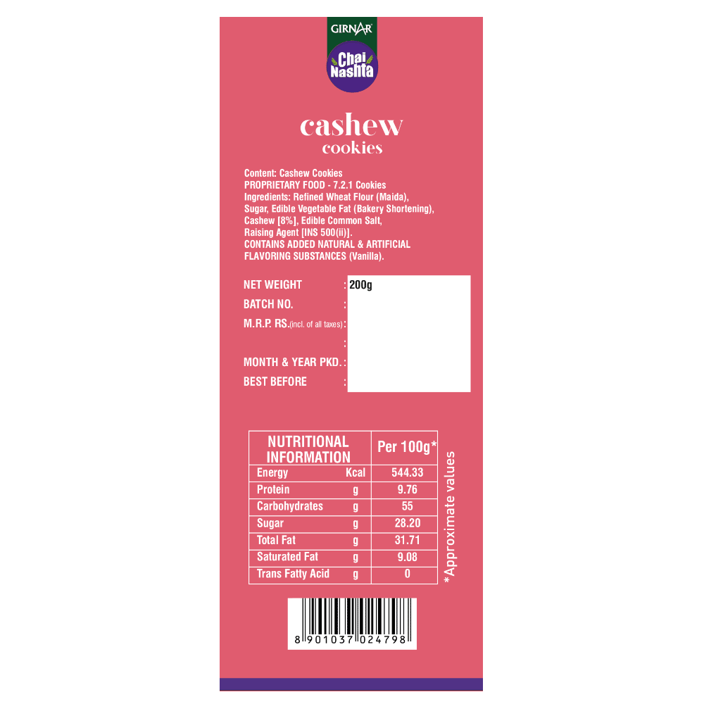 Refined Wheat Flour(45 %),Sugar, Edible Vegetable Fat, Cashew, Edible Common Salt, Raising Agent [INS 500(ii)], CONTAINS ADDED NATURAL & ARTIFICIAL FLAVOURING SUBSTANCES (Vanilla)