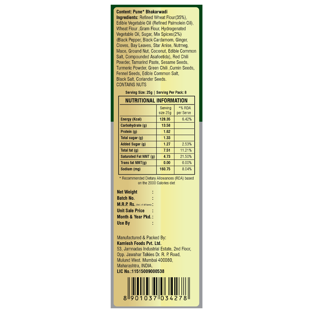 Refined Wheat Flour(35%), Edible vegetable oil (Refined Palmolein Oil), Wheat Flour ,Gram Flour, Hydrogenated Vegetable Oil, Sugar, Mix Spices(2%) (Black Pepper, Black Cardamom, Ginger,Cloves, Bay Leaves, Star Anise, Nutmeg, Mace, Ground Nut, Coconut, Edible Common Salt, Compounded Asafoetida), Red Chili Powde, Tamarind Paste, Sesame Seeds, Turmeric Powder, Green Chili ,Cumin Seeds, Fennel Seeds, Edible Common Salt,Black Salt, Coriander Seeds.