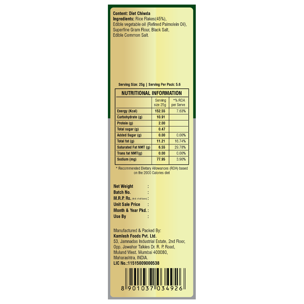 Rice Flakes(45%), Edible vegetable oil (Refined Palmolein Oil), Superfine Gram Flour, Black Salt, Edible Common Salt.